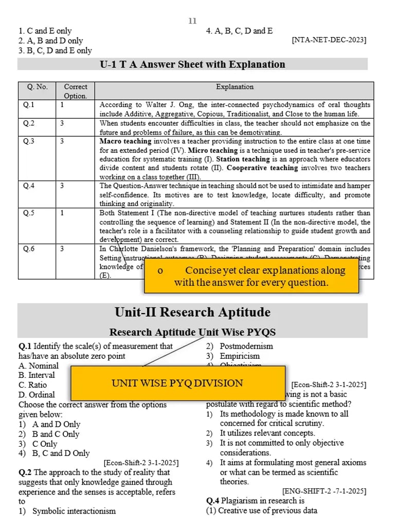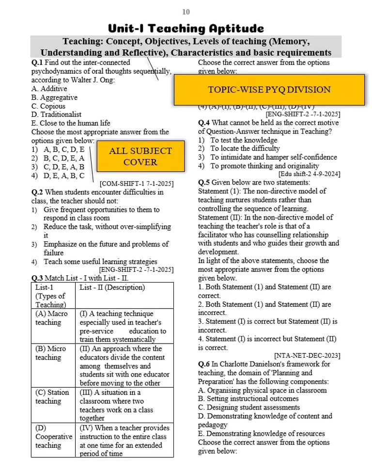 "As this book contains unit and sub-unit wise clear division, it will help to have a clearer understanding of the syllabus and question pattern. It will also help students to not only practise their own subject's PYQ but other subject's PYQ's as well. This will help students build a strong understanding over paper one as a whole.!"